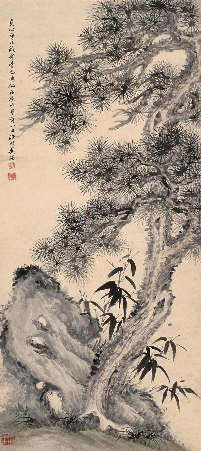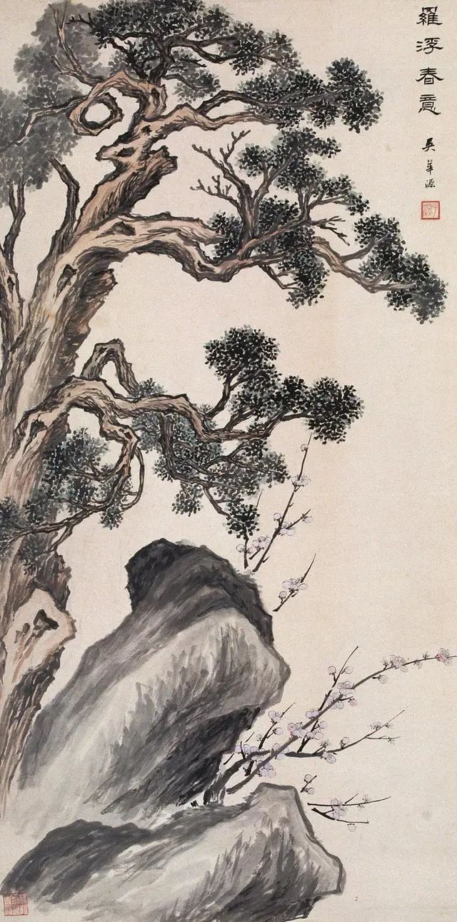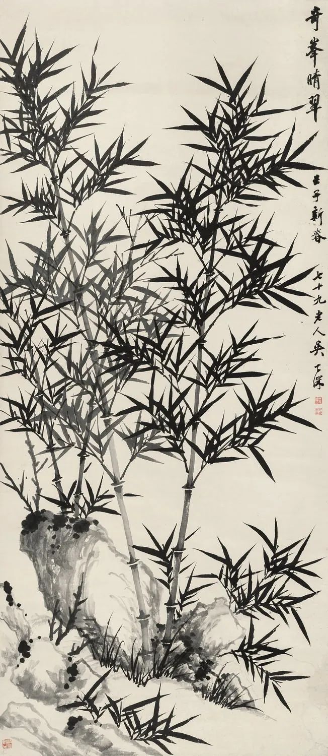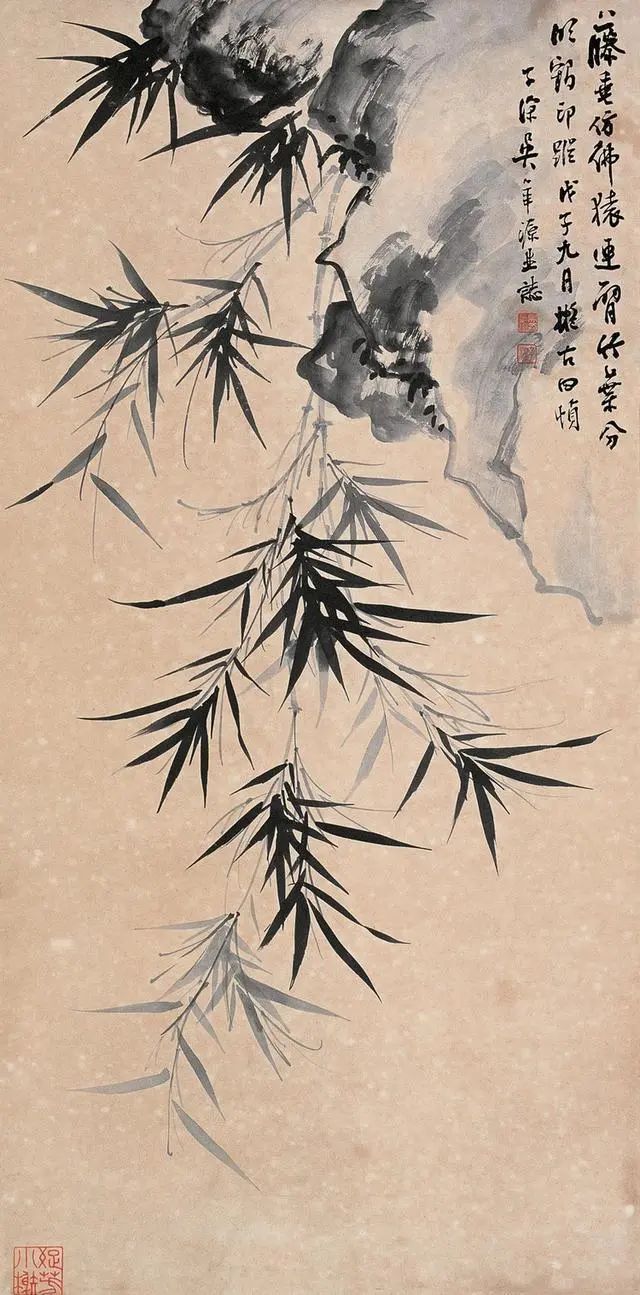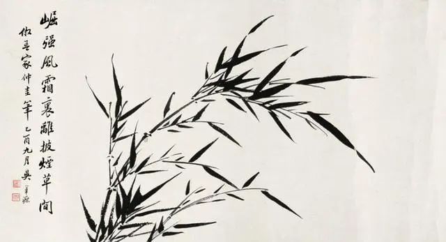 吴华源的竹,既有郑板桥"咬定青山"的孤傲,又多了几分时代风云的况味。他常在竹丛间添一两只麻雀,或以断崖残石作配景,看似闲笔,实则暗喻乱世中的坚守。正如他1937年所作《风雨竹图》,竹叶纷飞如剑,竹竿却挺立如戟,题款"任他八面风来,我自清骨不改",将文人画的隐逸精神升华为知识分子的气节宣言。