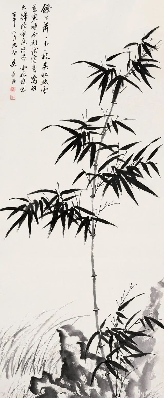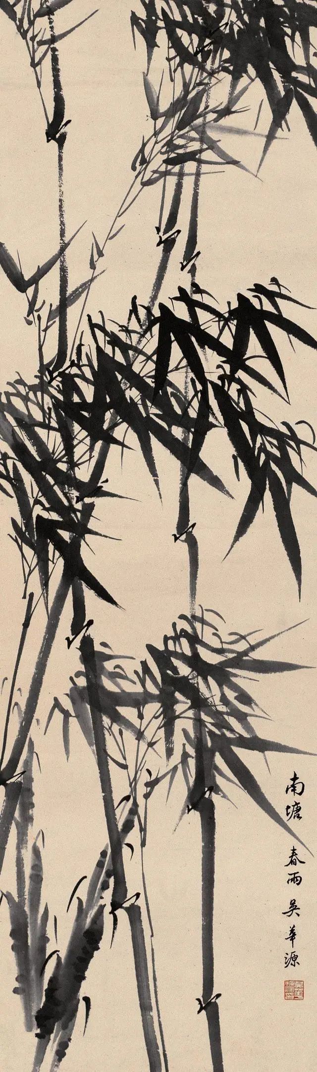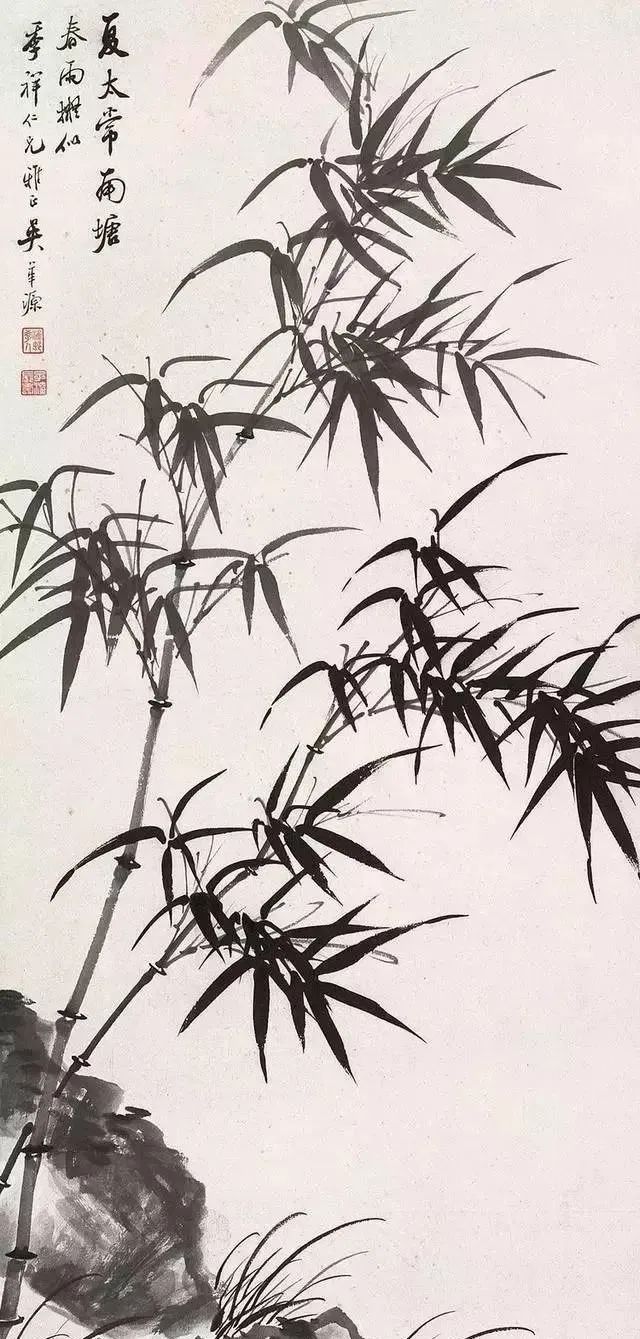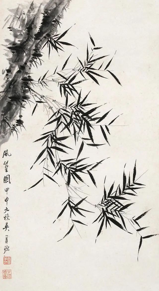 吴华源画竹,摒弃了繁复的枝叶铺陈,常以三两竿瘦竹立骨。他善用"骨法用笔",中锋勾勒的竹节如篆刻般遒劲,侧锋扫出的竹叶似书法挥洒。这种"以简驭繁"的手法,让每一根线条都成为承载气韵的载体——竹节处的顿挫暗含岁月沉淀,叶尖的翻转透着生命律动,看似简单的构图里,藏着"一花一世界"的禅意。