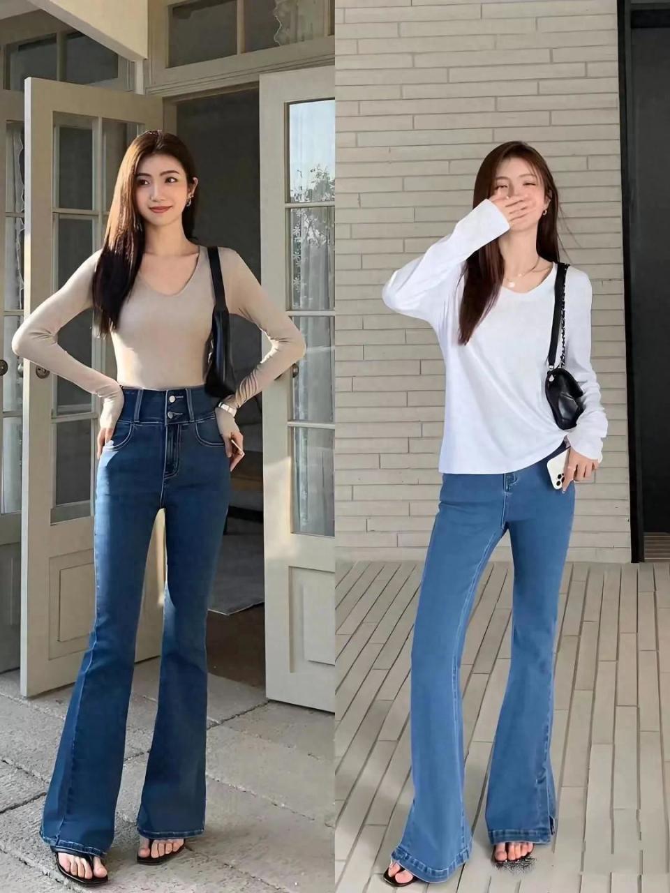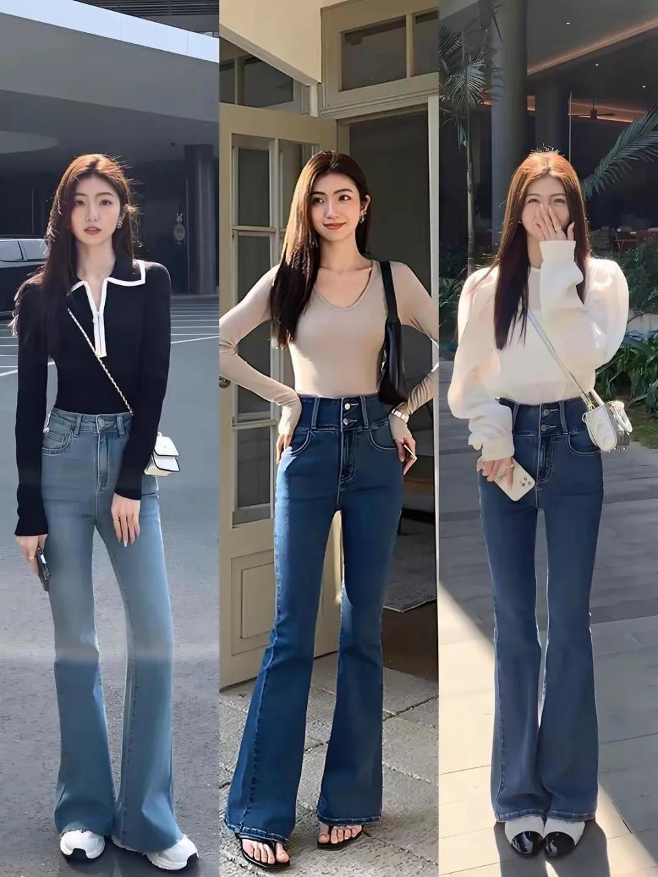 所以选择牛仔微喇叭裤,尽量是偏瘦的女性,而且大腿要纤细一些,同时臀部的臀型要挺翘有型,才能像下面这位达人一样穿出大长腿,展露出自己高挑纤瘦笔直的美腿。