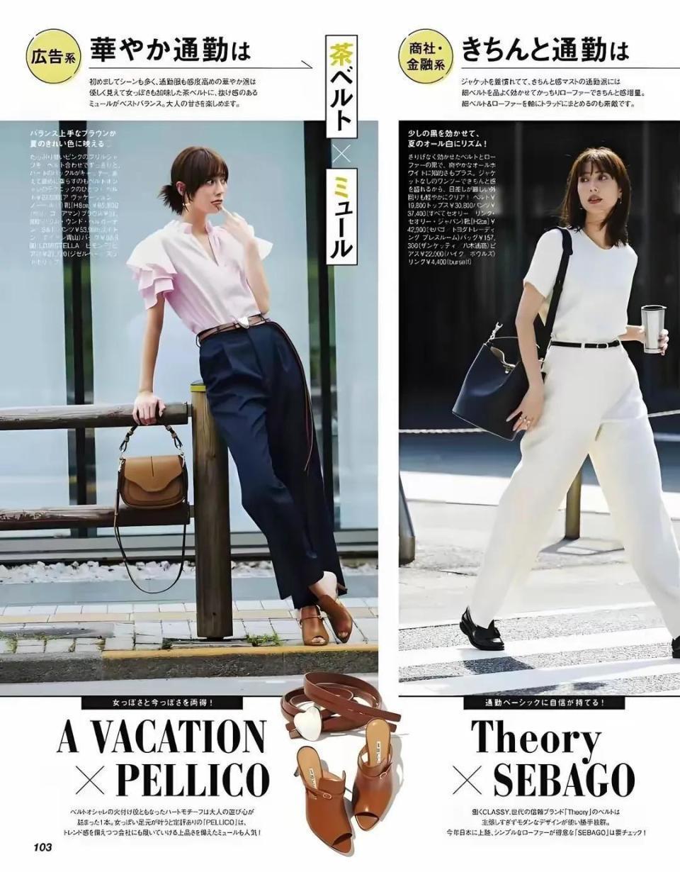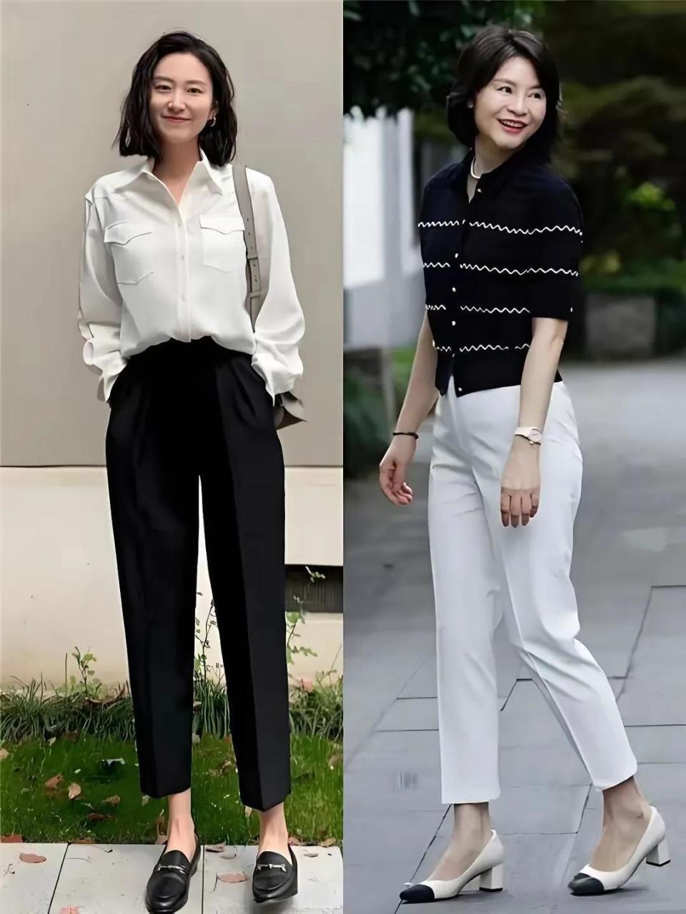 例如下面白色的衬衫上再搭配上黑色的九分西裤,脚上穿的一双黑色的乐福鞋或者是黑色的针织开衫短袖,搭配白色的九分西裤和一条黑白拼接的低跟单鞋,这两身穿衣打扮都非常符合奔三奔四的女性。
