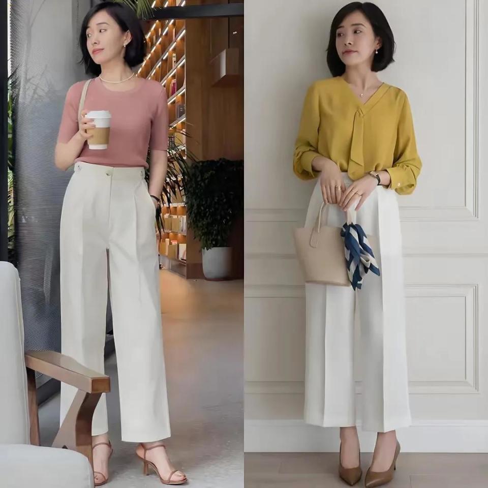 或者说我们可以选择比较有品质的浅色系,暖色系的衣服来搭配,例如下面粉色的针织上衣或者是黄色的雪纺衬衫,再搭配上一件有型的白色西装直筒裤,脚上穿了一双棕色的高跟凉鞋和咖色的浅口单鞋,这2套穿衣打扮就很适合奔三奔四的女性穿搭,而且看起来就很精致。