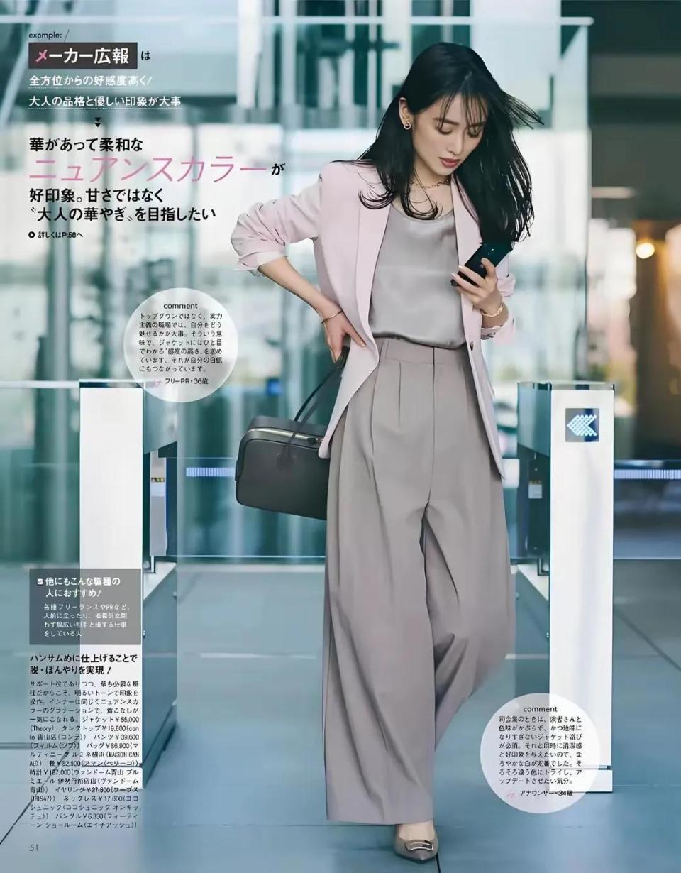 咱们可以选择透气性好的,挺阔有型的西服外套,比如下面这一件粉色的西装外套,内搭灰色的打底衫和一条灰色的西装阔腿裤,脚上穿的一双尖头的高跟鞋,这一身穿衣打扮不光显得年轻,而且休闲大气,特别是下面这一条灰色的西装阔腿裤,做了一个高腰收腰的设计,加上面料也很好,穿在身上之后就能让穿搭者变得非常的干练,而且很有品质。