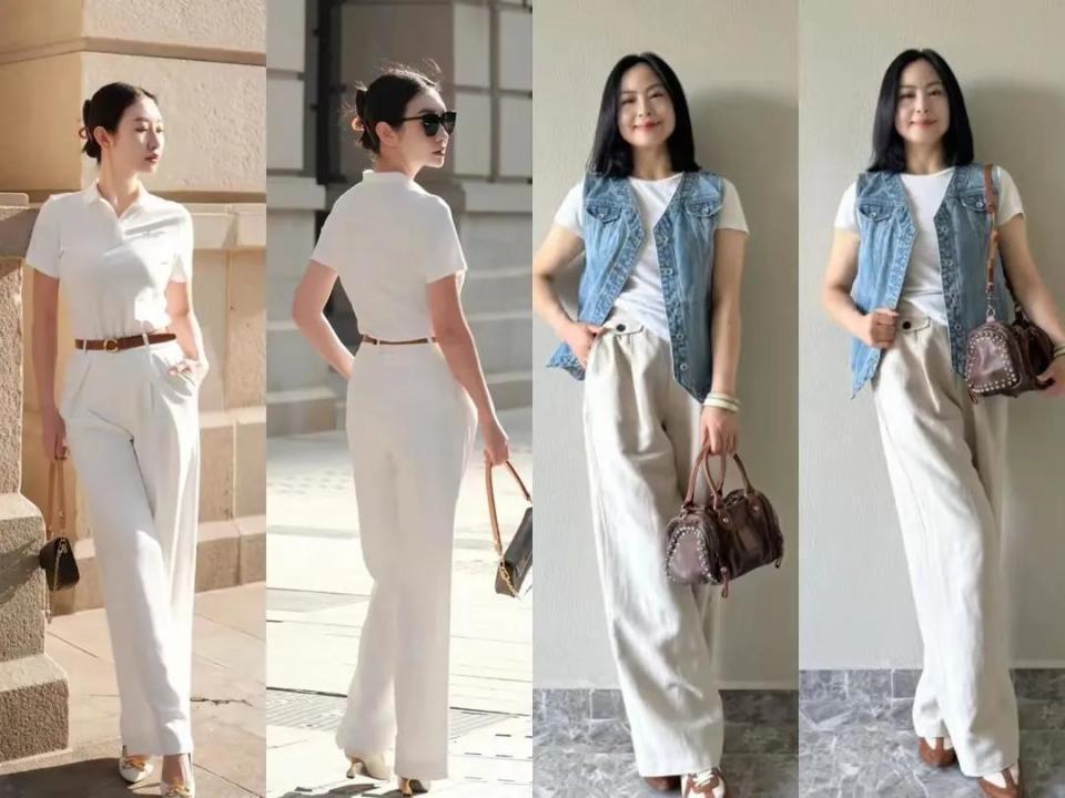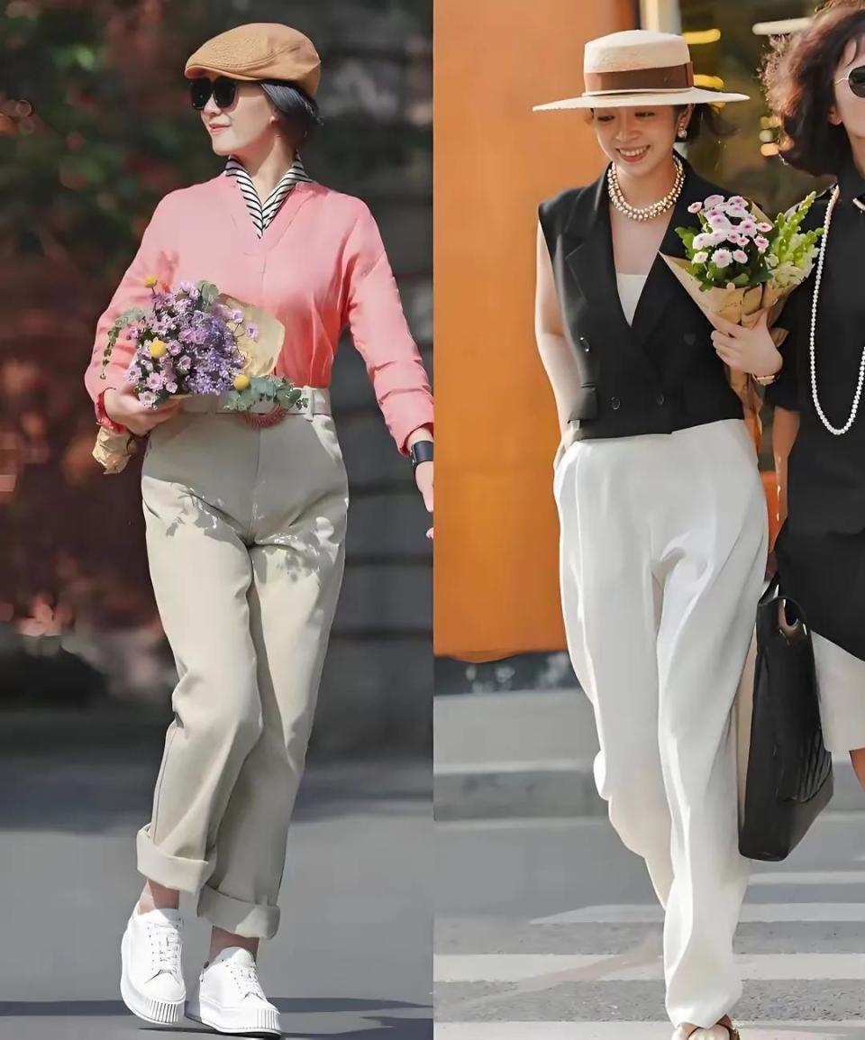 而且西装裤很适合职场女性,例如用一件黑色的西服马甲搭配上白色的西装裤,头上戴着一款草帽,这一身穿搭显得通勤又时髦。