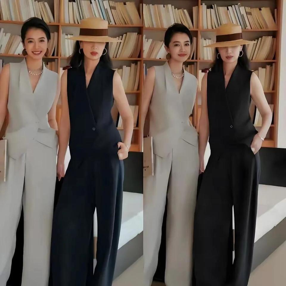 当然,你也可以选择最为基础的黑白灰衣服来搭配,但是只要设计款式到位,穿在身上也好看,例如下面这种西服马甲搭配上西服直筒阔腿裤,穿在身上之后,整个人也显得特别的干练。