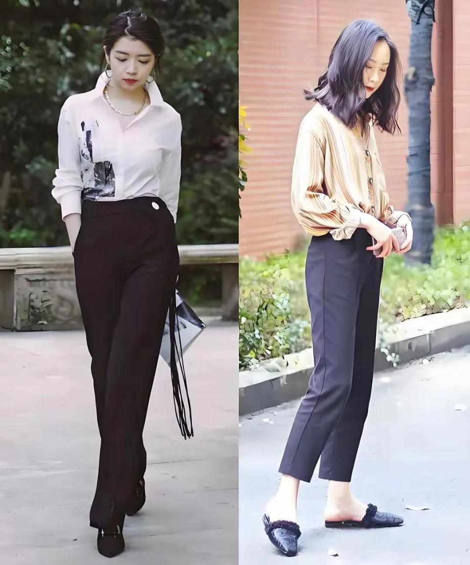 普通大众女性身材比例没有那么好的情况下,就尽量不要穿修身款的微喇叭裤了,还不如换成西装裤来穿搭,让你看起来更加干练。例如下面用一件白色衬衫搭,你搭配上一条黑色的西装裤,脚上踩了一双黑色的高跟鞋,轻轻松松穿出简约干练的造型。